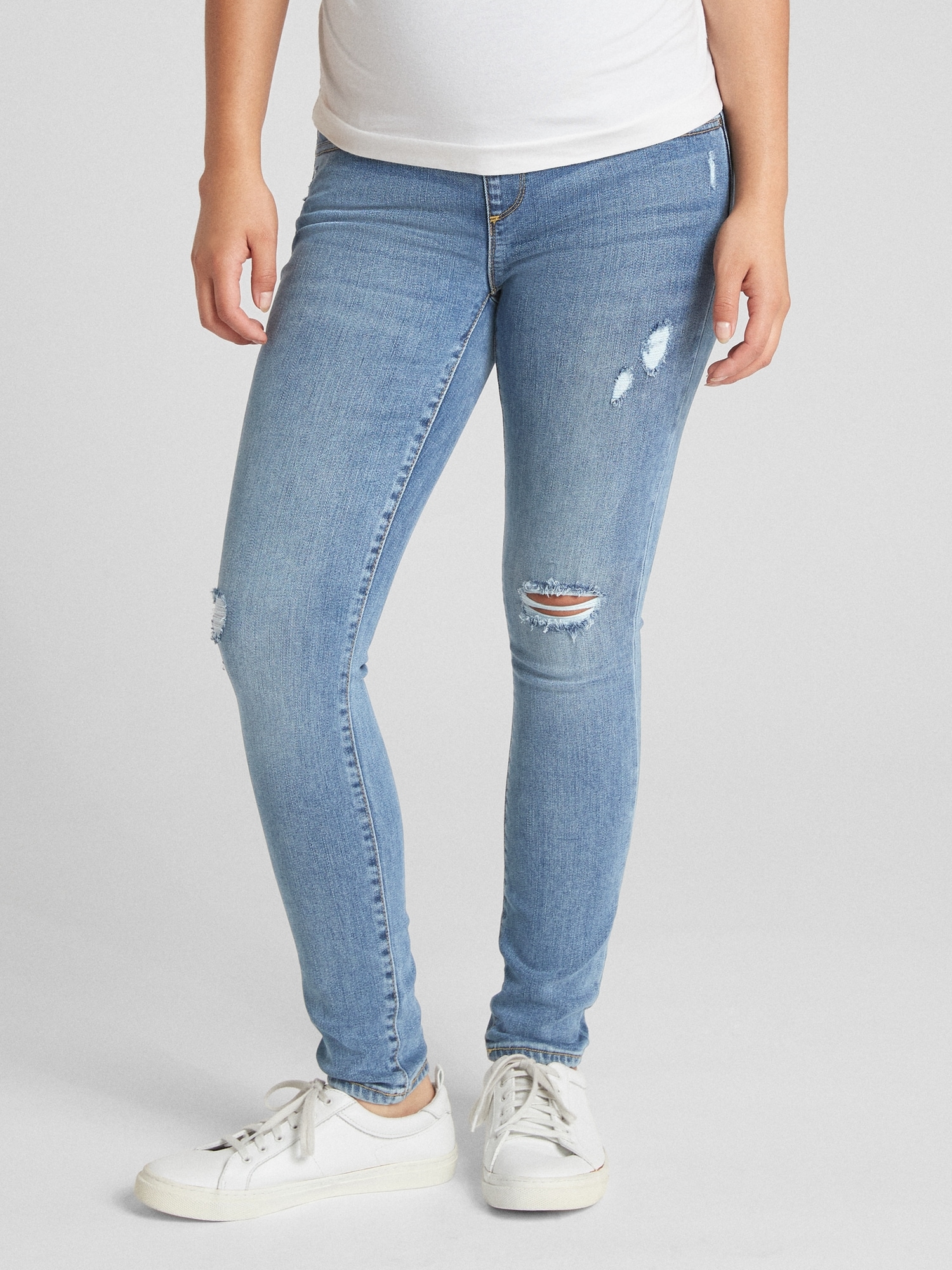 Distressed Maternity Skinny Jeans - You'll get a noticeable effect with this pair that features whiskering, bleaching, and distressing, along with cuffs that can be rolled up or down.