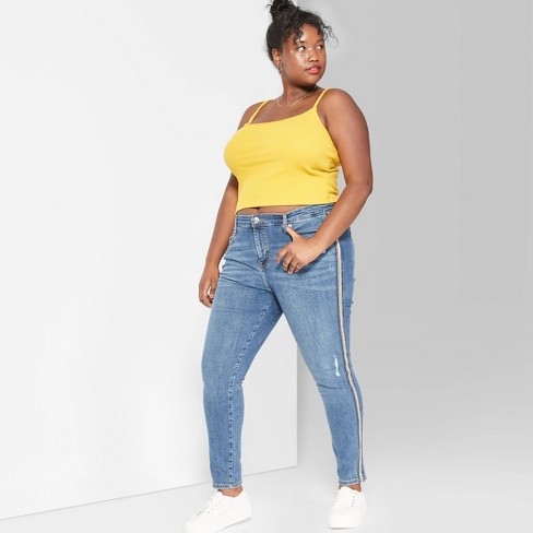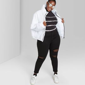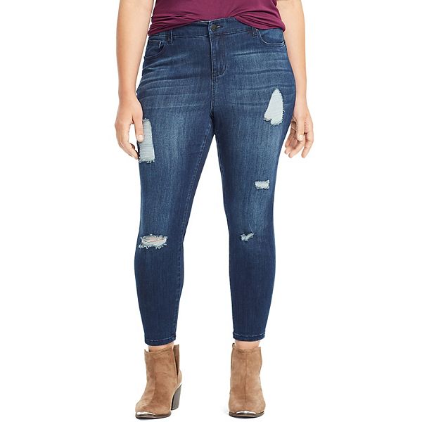 Plus Size Distressed Skinny Jeans / Plus button detail pinafore denim dress without tee.